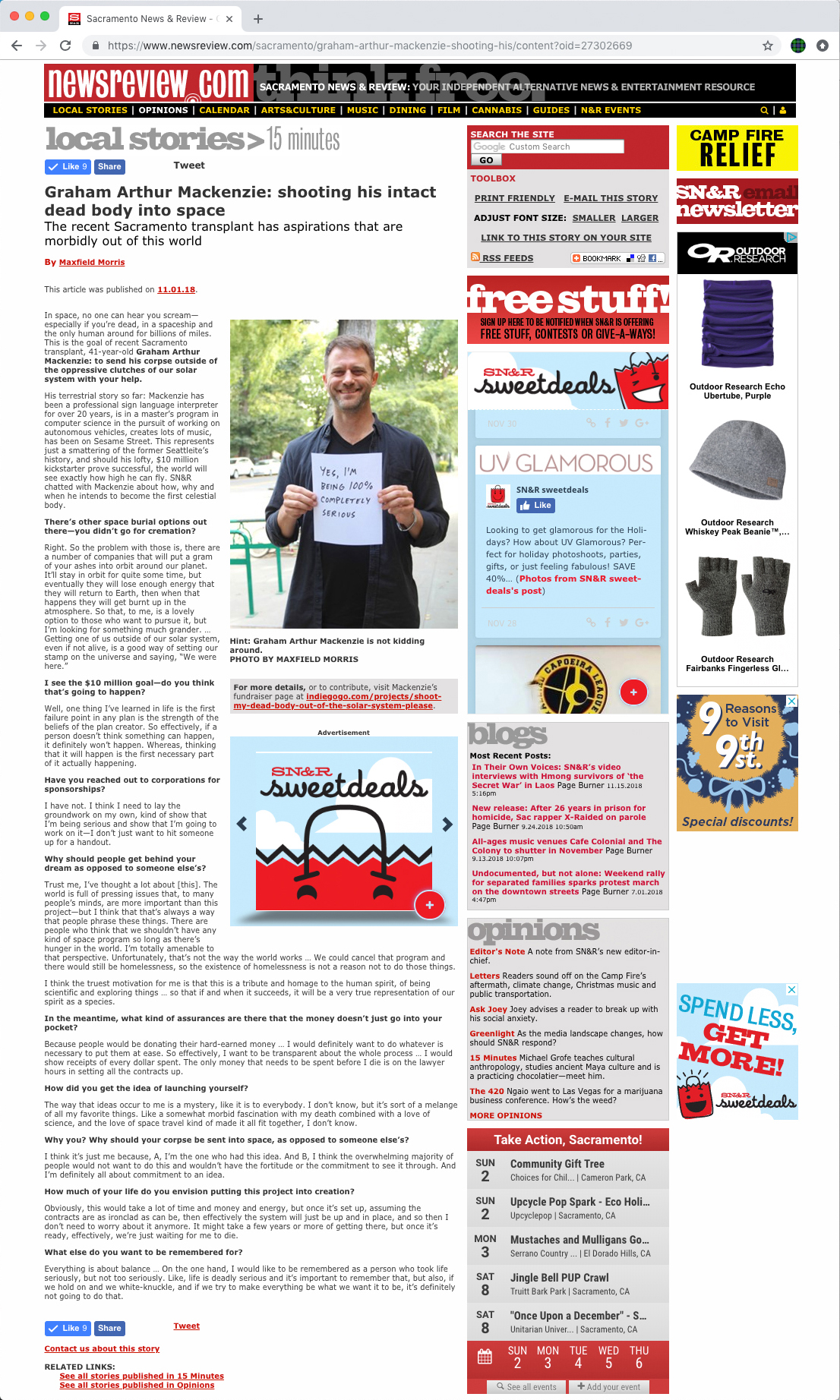 I love space. I love space travel. I love the idea of my dead body - instead of mouldering and turning to dust in the ground here on our home planet of Earth - rocketing to the farthest edge of our galaxy, and (most likely) orbiting it until the literal end of time.